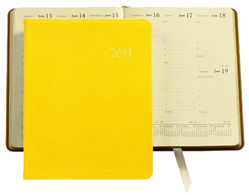 - 2011 Desk Diary is 7 x 9 1/4-inches, available in a luxurious yellow goatskin leather; flexible cover with Smyth-sewn bindings for strength and longevity; cream-white, acid-free paper with gilt edges and a double-faced cream satin ribbon marker